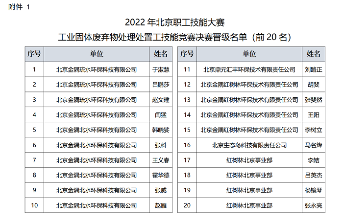 2022 年北京市職工職業(yè)技能大賽工業(yè)固體廢物處理處置工技能競賽的復(fù)賽( 實操) 工作已于 2022 年 10 月 28 日結(jié)束,經(jīng)競賽組委會研究決定, 現(xiàn)將進入決賽的選手名單( 附件 1)予以公示, 并公布決賽參賽須知, 請各位參賽選手認真?zhèn)滟悾瑺巹?chuàng)佳績。