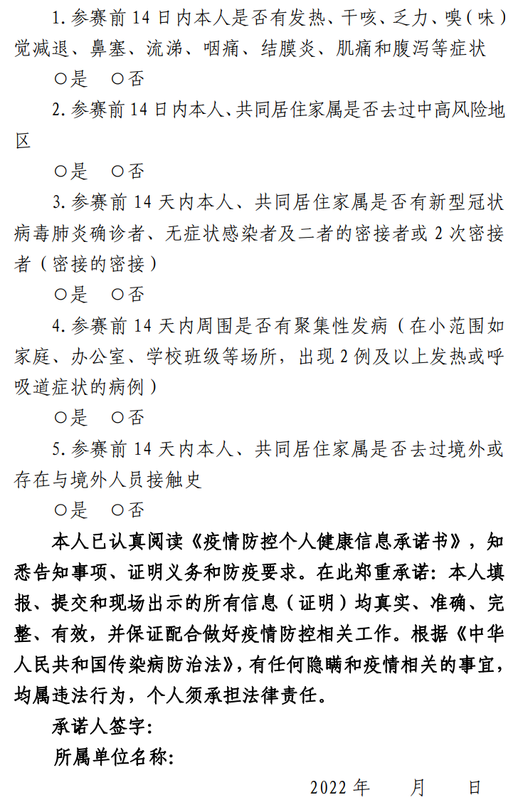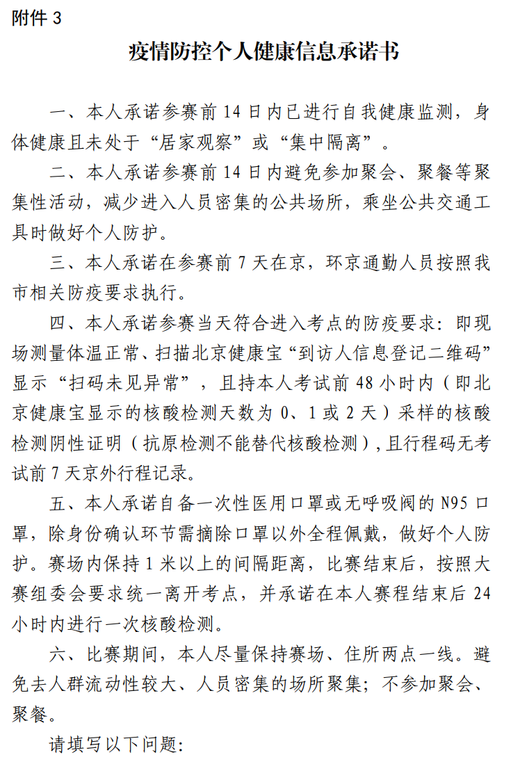 參加決賽的選手需嚴格遵守北京市疫情防控的有關(guān)規(guī)定,請考生提前申領(lǐng)北京健康寶, 查詢自身健康狀態(tài)。 考試當天,須持本人身份證、 《疫情防控個人健康信息承諾書》( 附件 3)、考試前 48 小時內(nèi)采樣的核酸檢測陰性證明( 即北京健康寶顯示的核酸檢測天數(shù)為 0、 1 或 2 天, 抗原檢測不能替代核酸檢測) 、 掃描北京健康寶“到訪人信息登記二維碼” 顯示“掃碼未見異常” 、 通信大數(shù)據(jù)行程卡無考試前 7 天京外行程記錄( 環(huán)京通勤人員須確認“通勤” 標識) , 且體溫正常, 方可進入考點參加考試。 所有考生應(yīng)在本人考試結(jié)束后 24 小時內(nèi)自行進行一次核酸檢測。