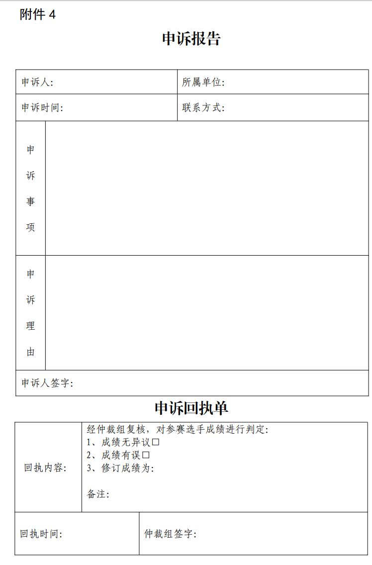 1.各參賽選手對競賽成績有異議的, 可向賽事仲裁組提出書面( 見附件 4 申訴報告) 申訴。